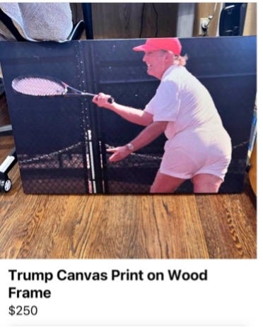 Thank you Judge McBurney for saying what so many of us have been trying to say for years and for doing so with a lot of eloquence and a little much-needed snark. It will be such a shame when the Supreme Court of Georgia overturns this impassioned decision. ** Always read the footnotes. In yet another unhinged rant that is not getting enough attention, Trump upped his cringe factor this weekend saying that he didn’t have to run for president, he could be sunbathing on the beach instead. “You have never seen a body so beautiful,” he said talking about himself, and went on to suggest that he has a much better build that Sleepy Joe. I never, ever want to see Donald Trump naked. However, I think we might all agree to give him huge ratings on his web-cam sunbathing show if he agreed to never, ever run for office, speak in public, or post on social media again.Yes. This picture of his beautiful body was selling on Facebook Marketplace for $250.Sex on Wednesday is free today. But if you enjoyed this post, you can tell Sex on Wednesday that their writing is valuable by pledging a future subscription. You won't be charged unless they enable payments. |